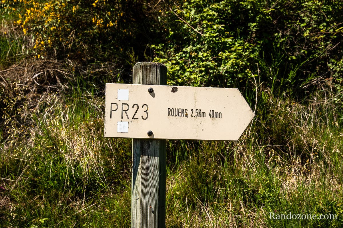 A la ferme, tourner à droite en direction de Rouens. Laissez la route goudronnée pour rejoindre à droite un chemin enherbé qui est à plat.