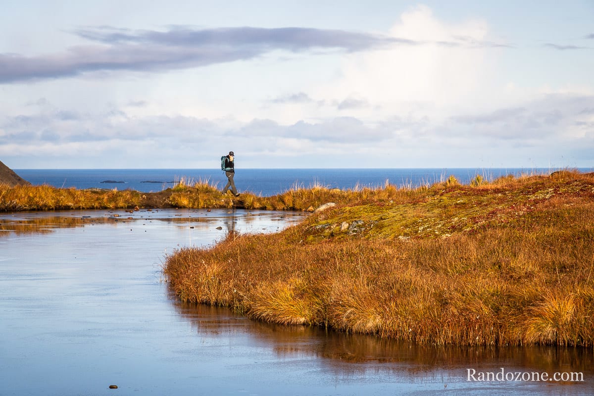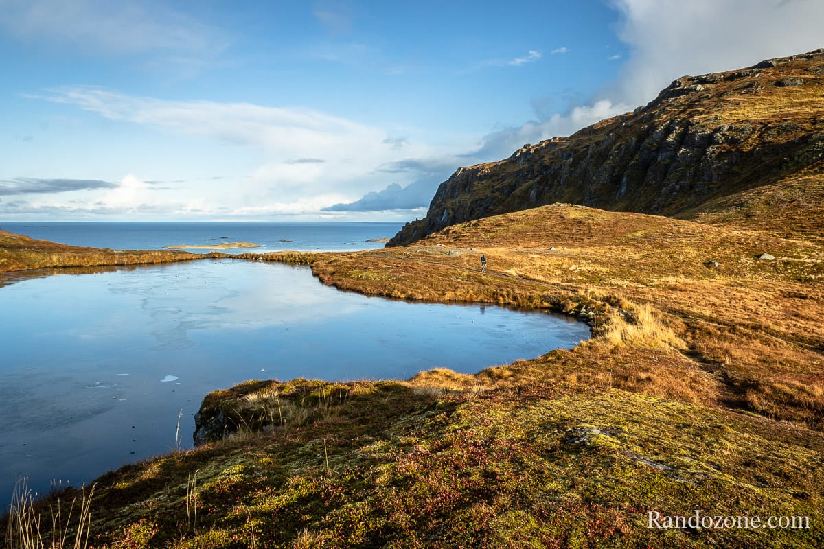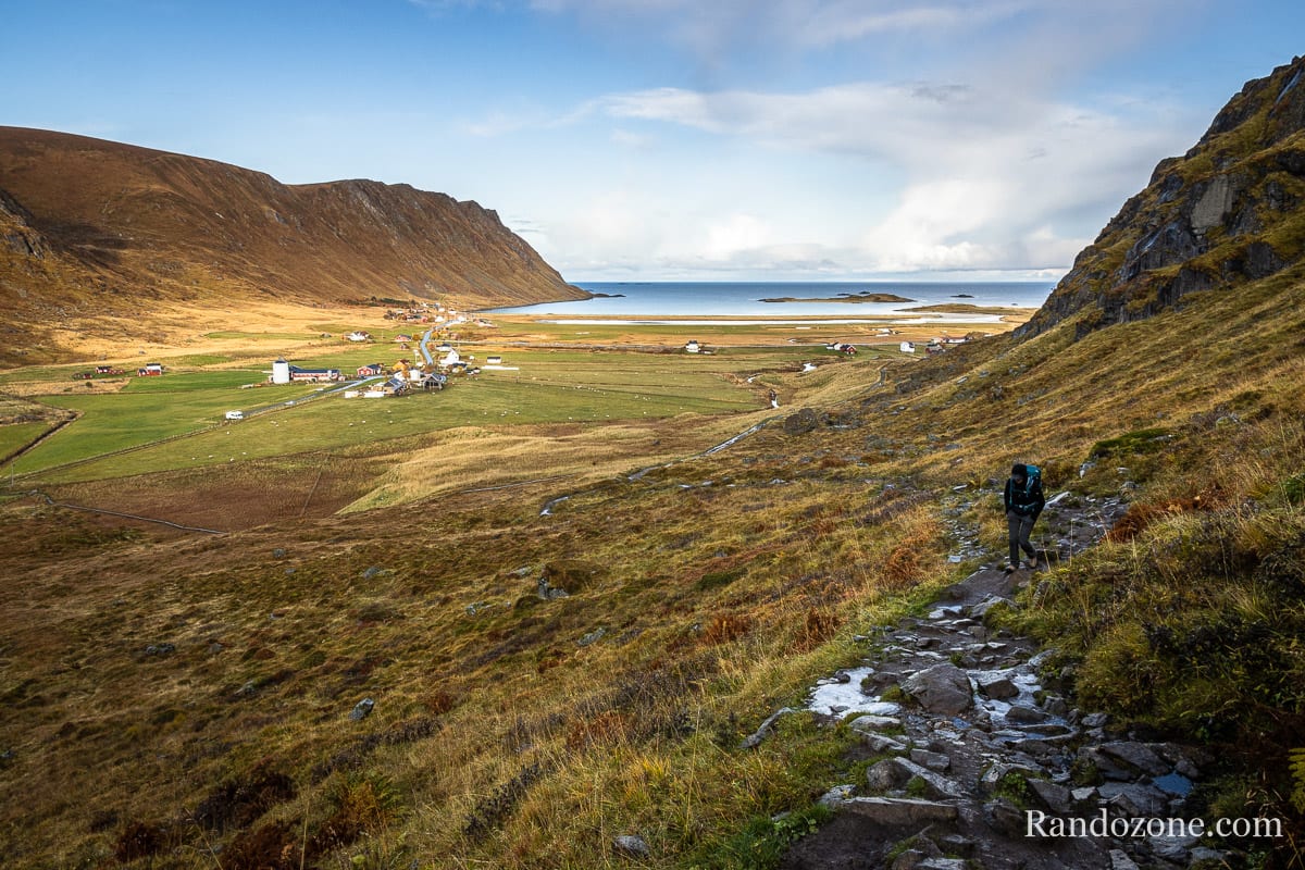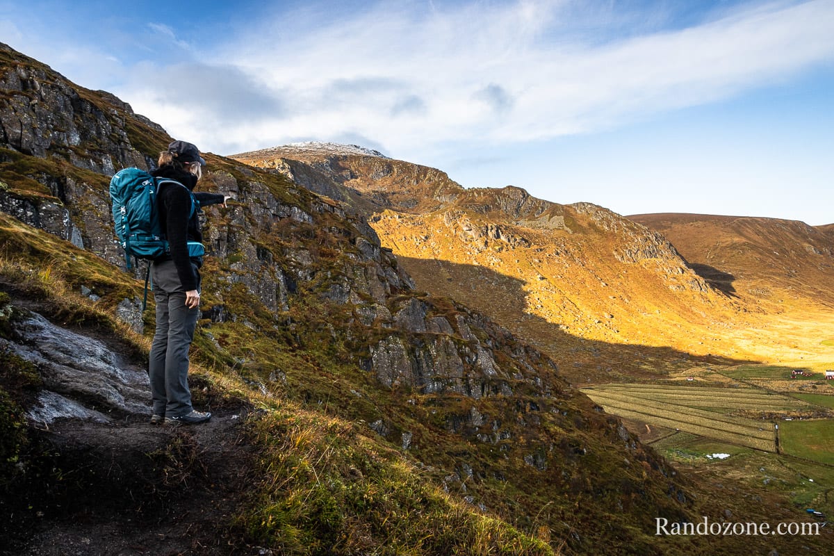 Puis on croise le chemin qui arrive de la plage de Kvalvika sur la gauche. A partir d’ici ça monte régulièrement à travers la tourbe recouverte de végétation. Optez pour le large chemin qui longe la falaise car on a une belle vue sur la plage durant tout le long.