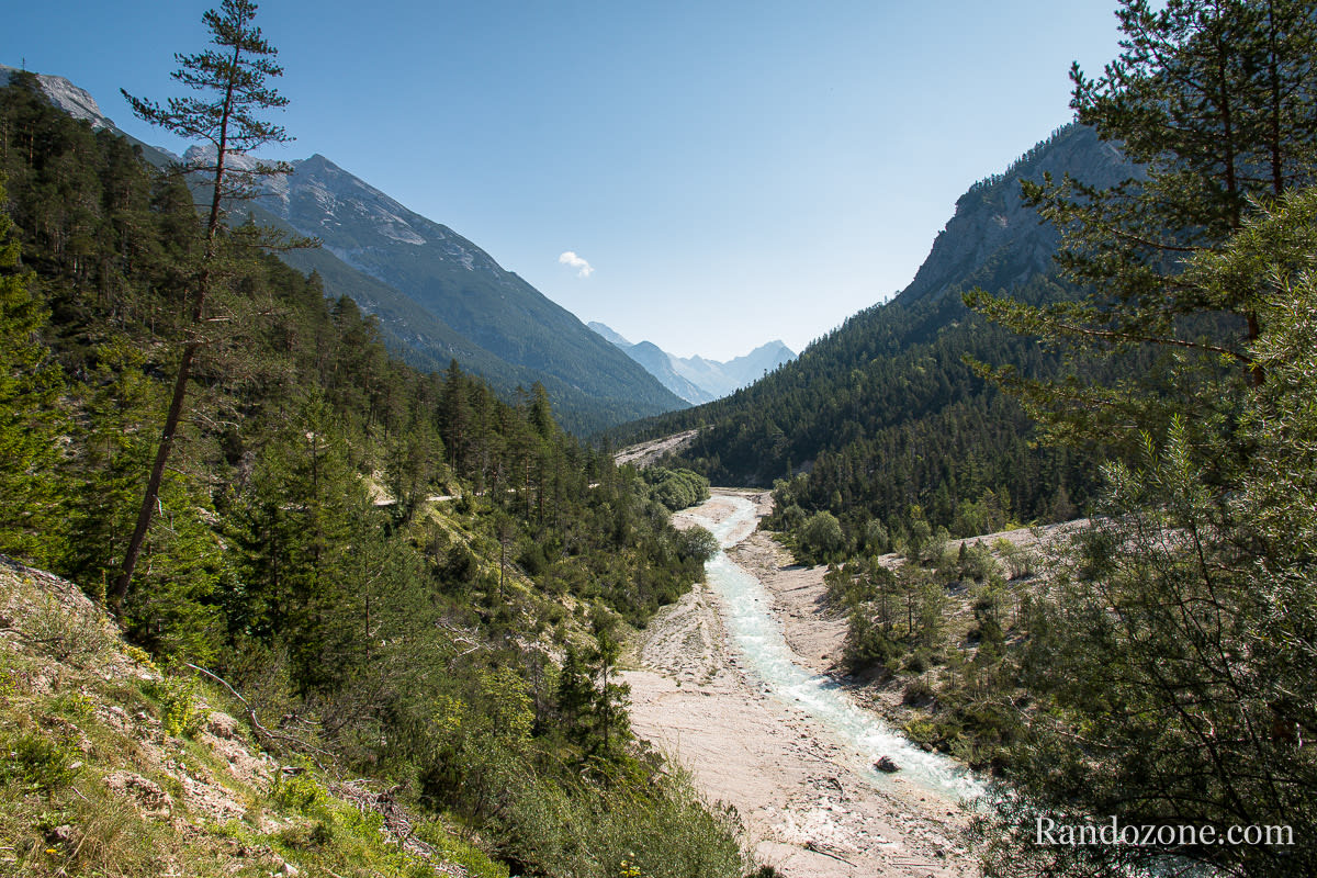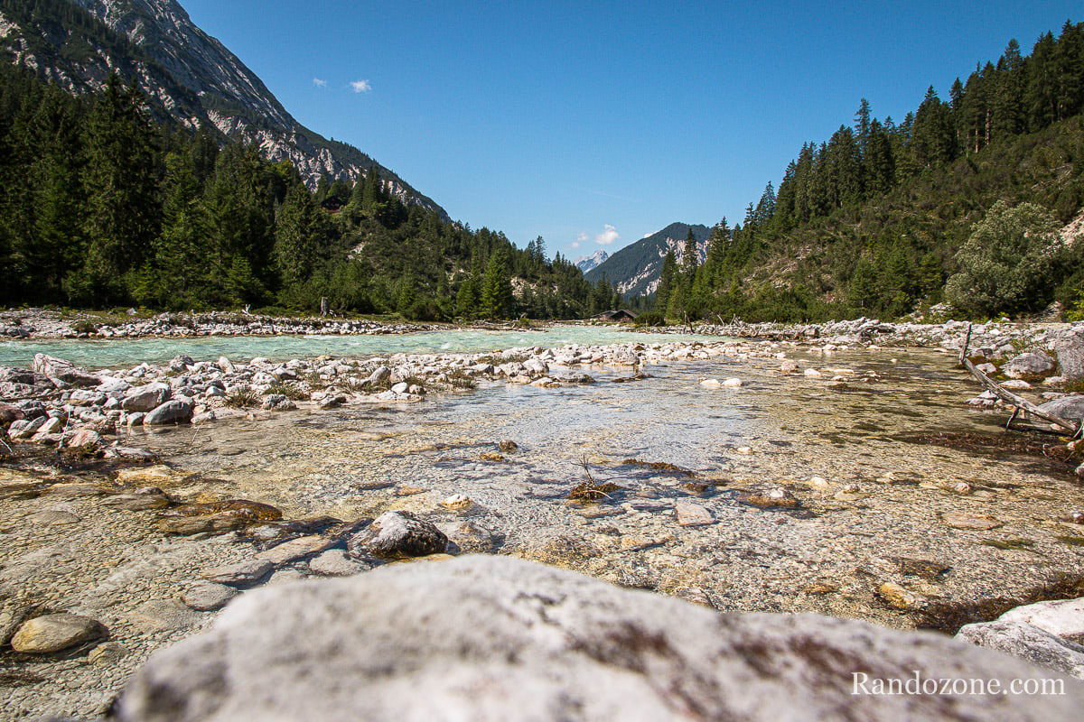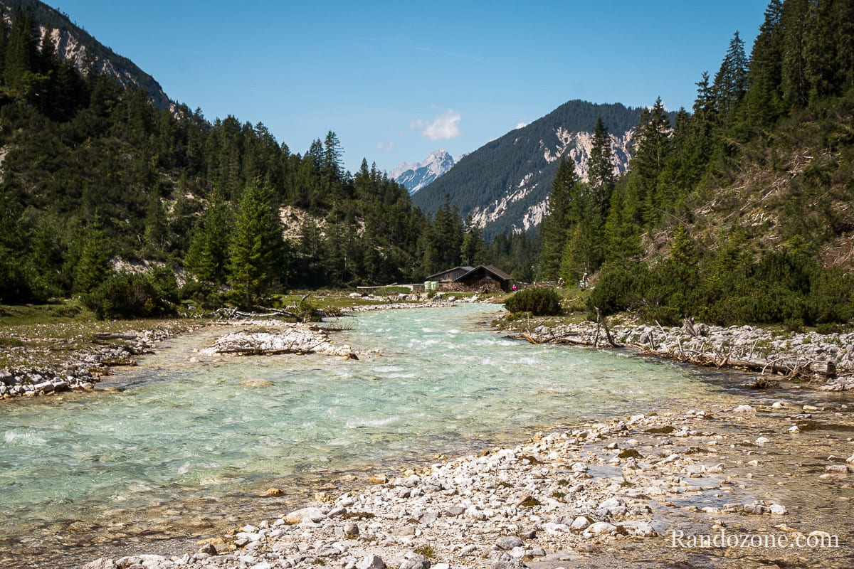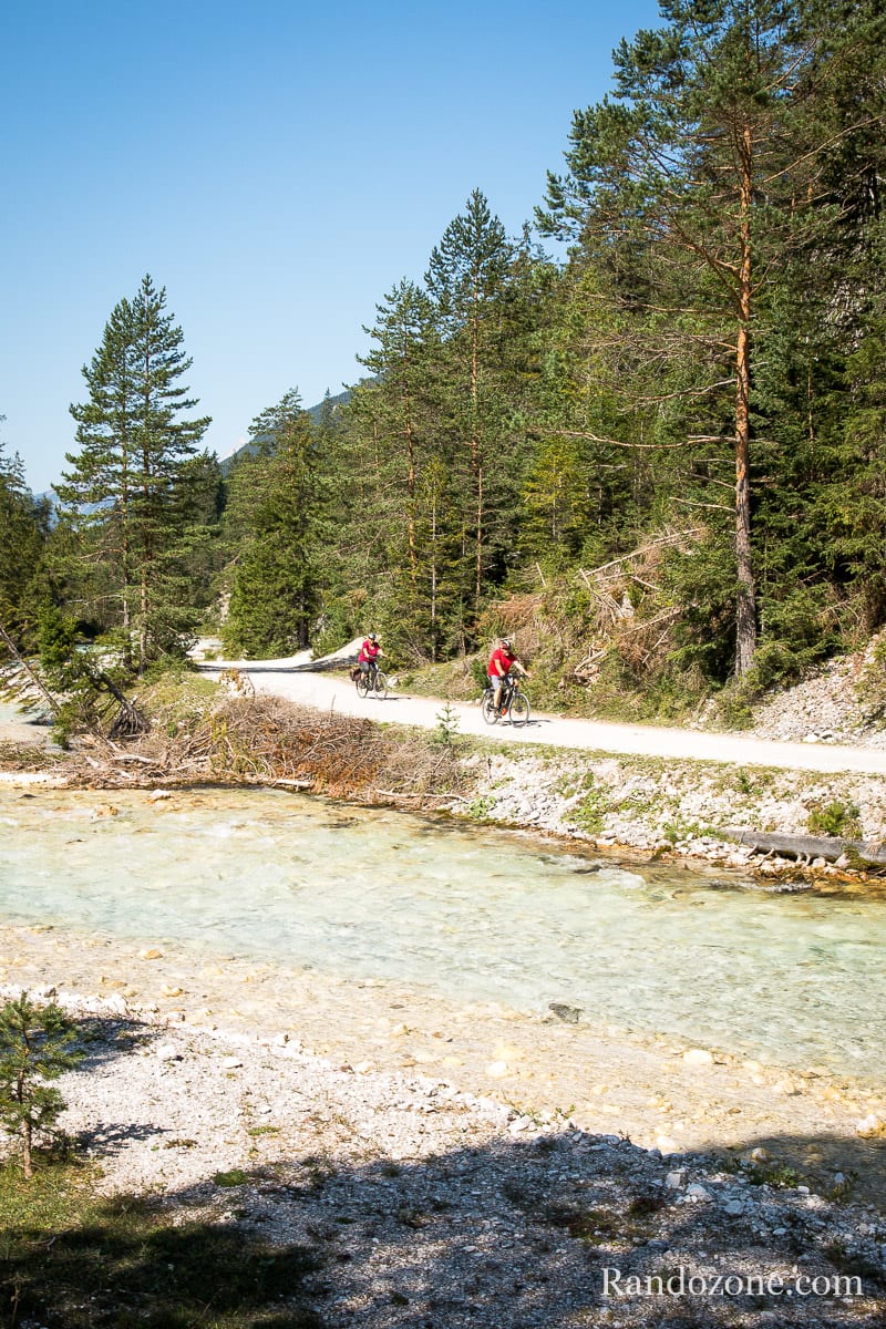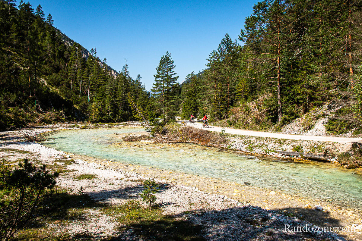 Le village est la porte d’entrée sur la vallée du Karwendel et la piste commence à la sortie du village. Dès le début on est dans une ambiance magnifique avec la rivière en contrebas et les montagnes sur les côté et en face de nous. On va longer la rivière en suivant la piste.