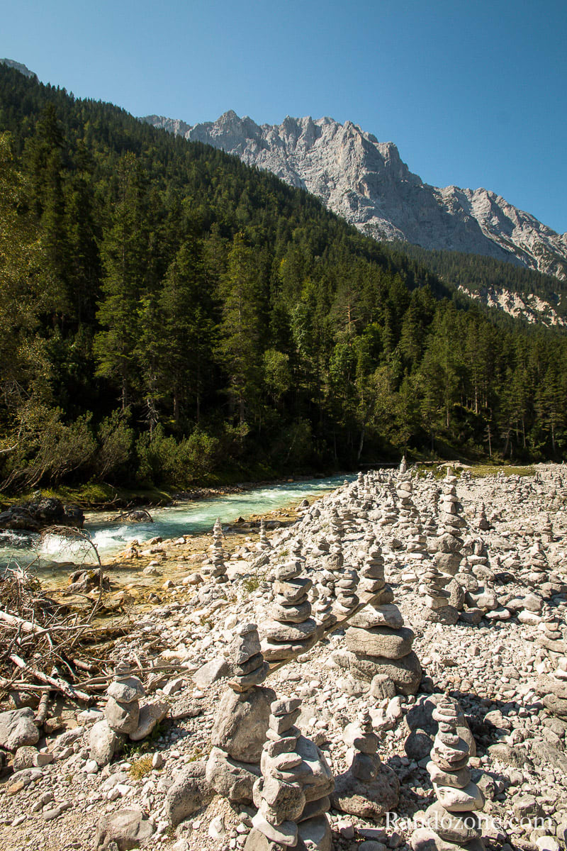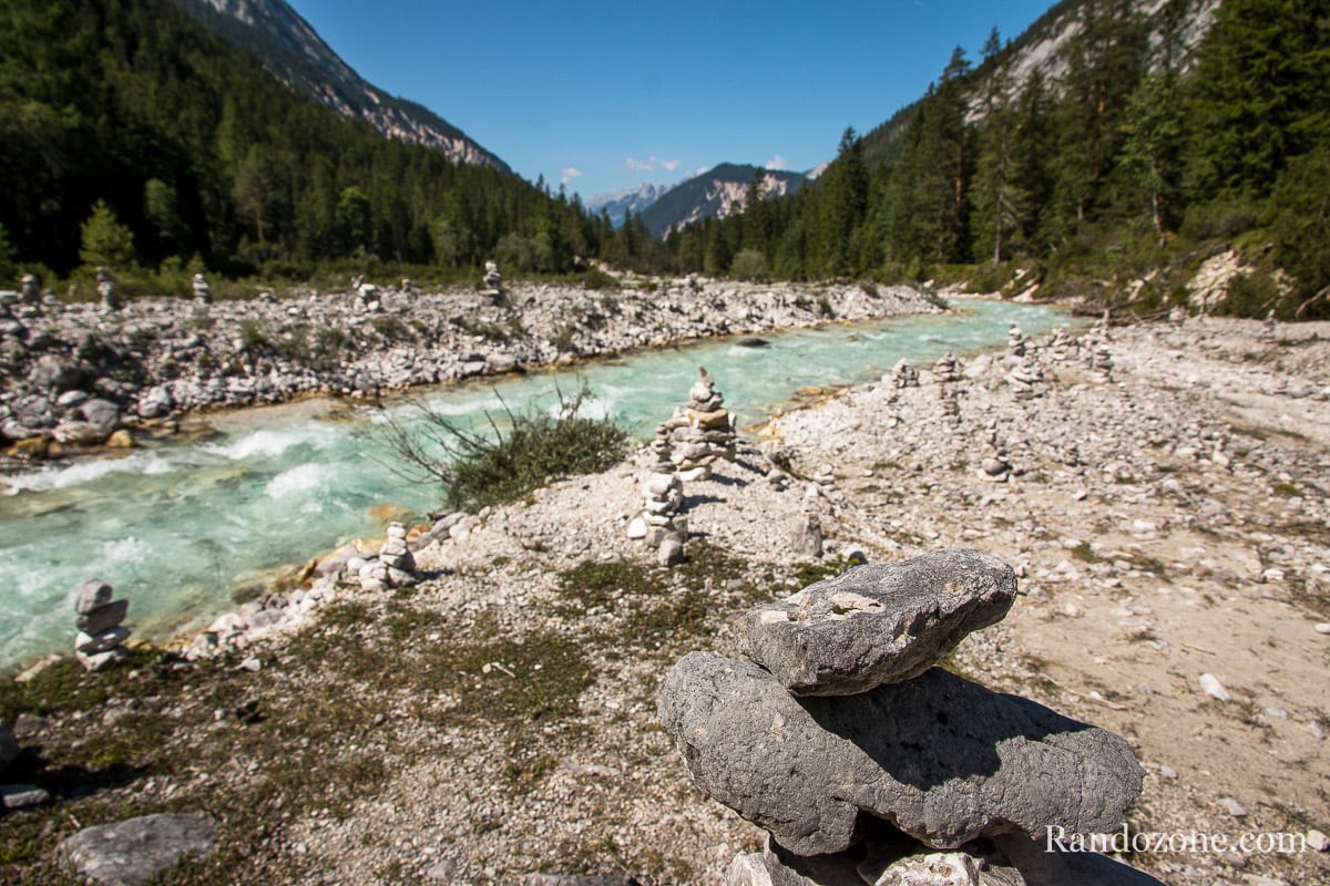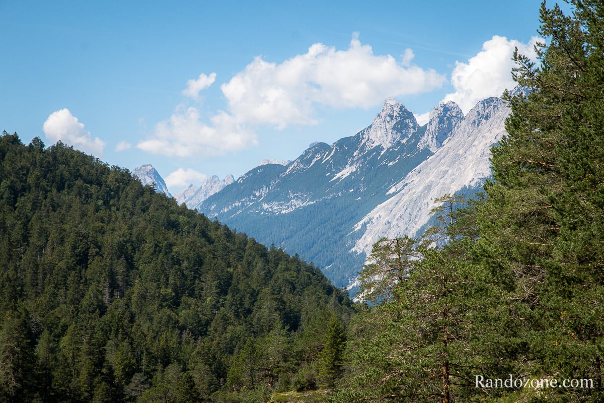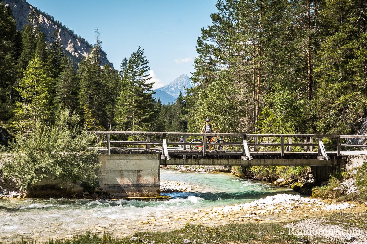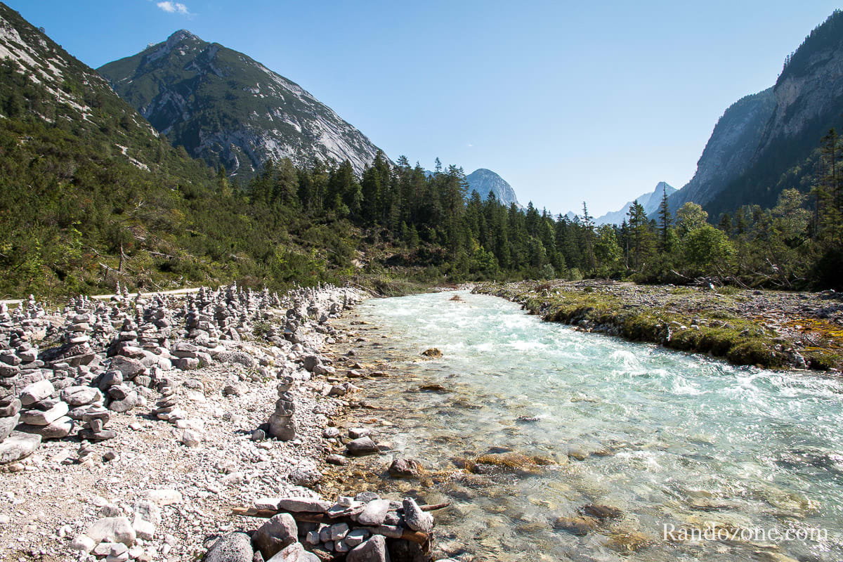 Le village est la porte d’entrée sur la vallée du Karwendel et la piste commence à la sortie du village. Dès le début on est dans une ambiance magnifique avec la rivière en contrebas et les montagnes sur les côté et en face de nous. On va longer la rivière en suivant la piste.