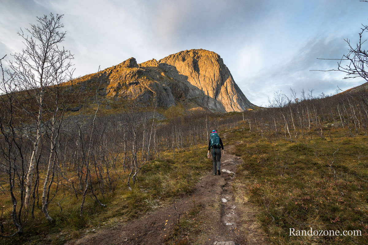 La montée débute ici sur une vaste piste de tourbe au milieu de la végétation. Puis il y a des passages en sous-bois sur des planches en bois car c'est très humide. Puis ça se met à grimper plus fort et sur notre gauche Segla nous fait déjà de l'oeil. Nous assistons au lever de soleil sur Segla durant notre montée, qu'est-ce que c'est beau ! Mais les gros nuages écourtent malheureusement ce spectacle de toute beauté.